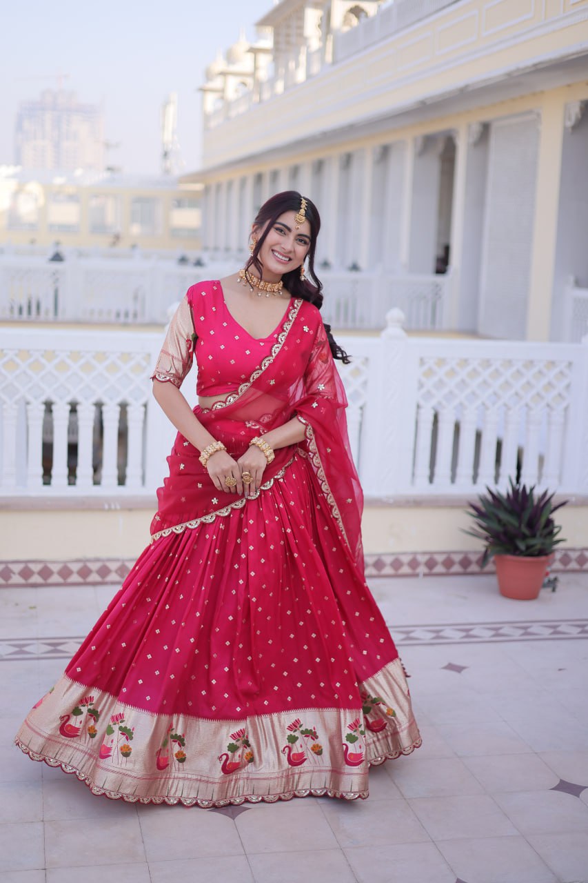 • FABRICS & WORK: Dola silk with Meena Weaving With Sequins coding Embroidered lace Work.
