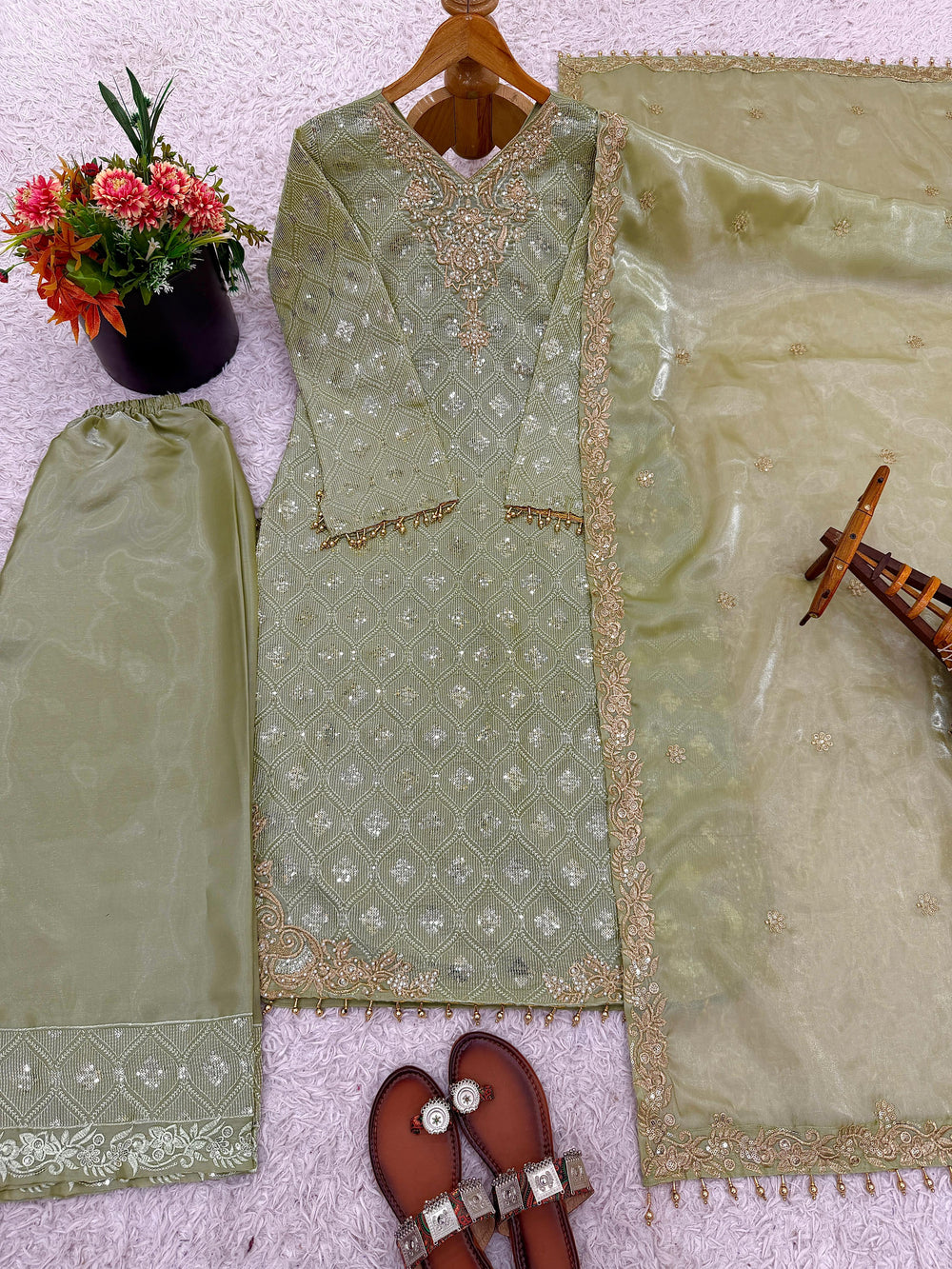 Presenting New Designer Collection In GMY SILK With Heavy Embroidery Sequence Work Top-Bottom And Dupatta Set Fully Stitched Ready To Wear