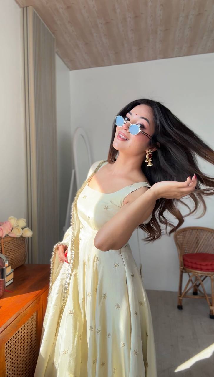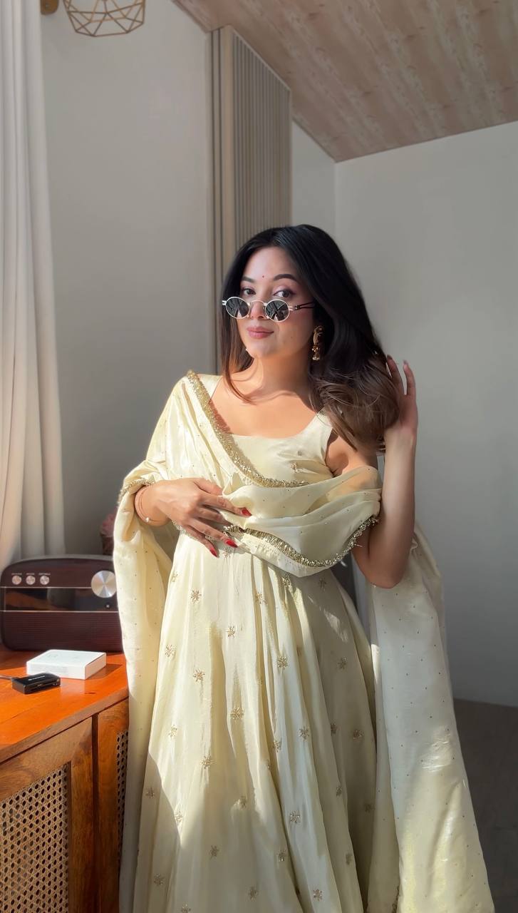 Designer Collection In Cosmos Gold With Embroidery Work Gown And Dupatta Set (Fully Stitched Ready To Wear)